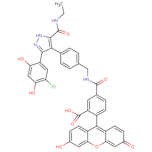 Fluorescence polarization assay probe | 5-[({4-[3-(5-chloro-2,4-dihydroxyphenyl)-5-(ethylcarbamoyl)-1H-pyrazol-4-yl]phenyl}methyl)carbamoyl]-2-(6-hydroxy-3-oxo-3H-xanthen-9-yl)benzoic acid | VER-00051001