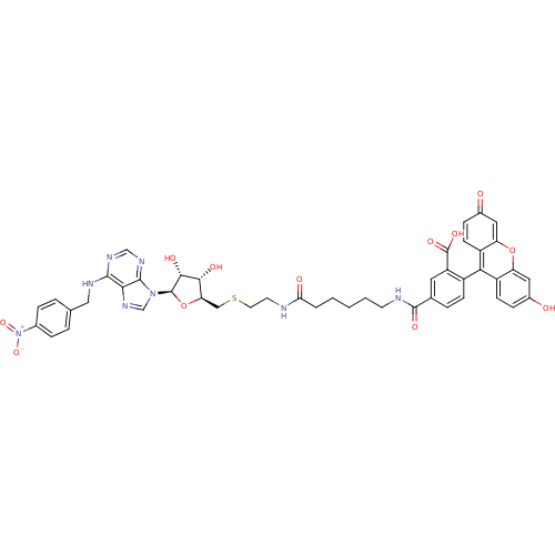 5-[(5-{[2-({[(2S,3S,4R,5R)-3,4-dihydroxy-5-(6-{[(4-nitrophenyl)methyl]amino}-9H-purin-9-yl)oxolan-2-yl]methyl}sulfanyl)ethyl]carbamoyl}pentyl)carbamoyl]-2-(6-hydroxy-3-oxo-3H-xanthen-9-yl)benzoic acid | 5-(SAENTA)-X8-fluorescein