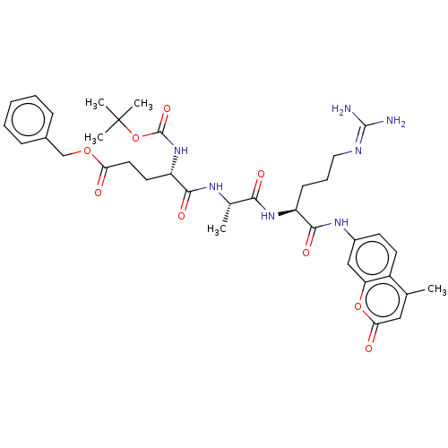 [#6]-[#6@H](-[#7]-[#6](=O)-[#6@H](-[#6]-[#6]-[#6](=O)-[#8]-[#6]-c1ccccc1)-[#7]-[#6](=O)-[#8]C([#6])([#6])[#6])-[#6](=O)-[#7]-[#6@@H](-[#6]-[#6]-[#6]\[#7]=[#6](\[#7])-[#7])-[#6](=O)-[#7]-c1ccc2c(-[#6])cc(=O)oc2c1