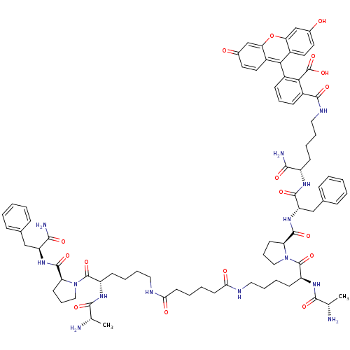 C[C@H](N)C(=O)N[C@@H](CCCCNC(=O)CCCCC(=O)NCCCC[C@H](NC(=O)[C@H](C)N)C(=O)N1CCC[C@H]1C(=O)N[C@@H](Cc1ccccc1)C(=O)N[C@@H](CCCCNC(=O)c1cccc(c1C(O)=O)-c1c2ccc(O)cc2oc2cc(=O)ccc12)C(N)=O)C(=O)N1CCC[C@H]1C(=O)N[C@@H](Cc1ccccc1)C(N)=O |r,wU:99.105,95.102,6.5,25.25,38.39,42.42,wD:1.1,29.30,53.54,(4.35,5.14,;4.35,3.6,;5.69,2.83,;3.02,2.83,;3.02,1.29,;1.69,3.6,;.35,2.83,;.35,1.29,;1.69,.52,;1.69,-1.02,;3.02,-1.79,;3.02,-3.33,;4.35,-4.1,;5.69,-3.33,;4.35,-5.64,;5.69,-6.41,;5.69,-7.95,;7.02,-8.72,;7.02,-10.26,;5.69,-11.03,;8.35,-11.03,;8.35,-12.57,;9.69,-13.34,;9.69,-14.88,;11.02,-15.65,;11.02,-17.19,;9.69,-17.96,;8.35,-17.19,;8.35,-15.65,;7.02,-17.96,;7.02,-19.5,;5.69,-17.19,;12.35,-17.96,;12.35,-19.5,;13.69,-17.19,;13.52,-15.66,;14.93,-15.03,;15.96,-16.17,;15.2,-17.5,;15.83,-18.91,;14.93,-20.16,;17.36,-19.06,;18.26,-17.81,;17.63,-16.41,;18.53,-15.16,;18,-13.72,;18.98,-12.53,;20.5,-12.79,;21.03,-14.24,;20.05,-15.42,;19.79,-17.97,;20.42,-19.38,;20.69,-16.72,;22.23,-16.72,;23,-18.06,;24.54,-18.06,;25.31,-19.39,;26.85,-19.39,;27.62,-20.72,;29.16,-20.72,;29.93,-19.39,;29.93,-22.06,;31.27,-21.29,;32.6,-22.06,;32.6,-23.6,;31.27,-24.37,;29.93,-23.6,;28.6,-24.37,;28.4,-25.89,;27.51,-23.28,;32.04,-25.7,;33.56,-25.5,;34.15,-24.07,;35.68,-23.87,;36.62,-25.09,;38.14,-24.88,;36.03,-26.51,;34.5,-26.72,;33.92,-28.14,;32.39,-28.34,;31.8,-29.77,;30.28,-29.97,;29.69,-31.4,;29.34,-28.75,;29.92,-27.33,;31.45,-27.12,;23,-15.39,;24.54,-15.39,;22.23,-14.05,;-.98,3.6,;-.98,5.14,;-2.32,2.83,;-2.49,1.3,;-4,1,;-4.76,2.34,;-3.72,3.47,;-4.12,4.96,;-2.78,5.73,;-5.45,5.73,;-6.78,4.96,;-6.78,3.42,;-8.12,2.65,;-9.56,3.18,;-10.74,2.19,;-10.48,.67,;-9.03,.14,;-7.85,1.13,;-8.12,5.73,;-9.45,4.96,;-8.12,7.27,)|