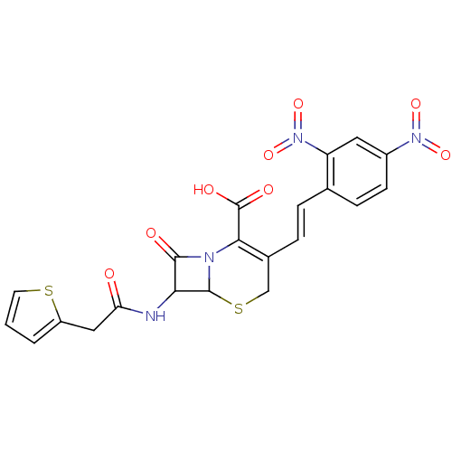 OC(=O)C1=C(CSC2C(NC(=O)Cc3cccs3)C(=O)N12)\C=C\c1ccc(cc1N(=O)=O)N(=O)=O |t:3|